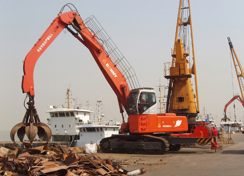 ●可以選擇配備多種工作裝置(抓斗)實現(xiàn)廢鋼、圓木、木屑、原煤、草料等多種物料的抓取、裝卸